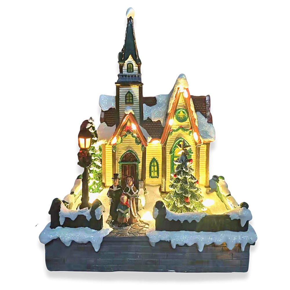 It's the most wonderful time of the year! This is a happy, peaceful scene. The snow has fallen, the lights are glowing, and children are skating through the streets. Size 19.5*15.5*28. USB power supply attached, also takes batteries. Lights up and carols play.